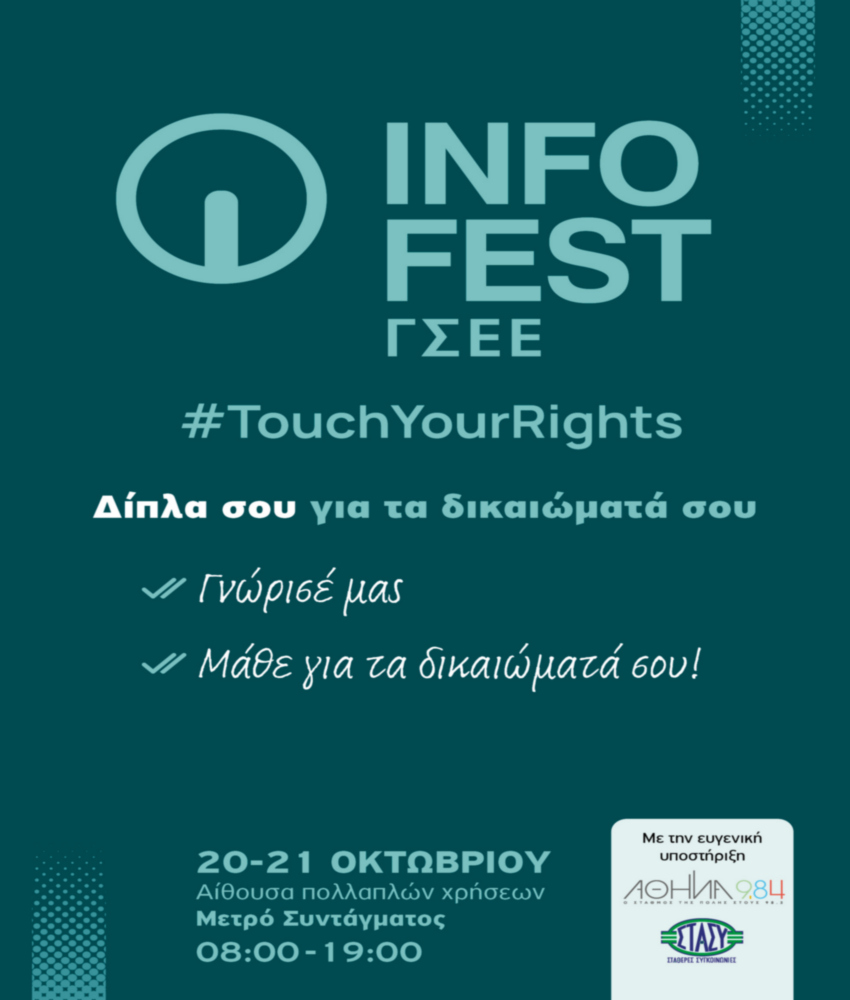 Η ΓΣΕΕ φέρνει την ενημέρωση για τα εργασιακά και κοινωνικά δικαιώματα στον πιο πολυσύχναστο κόμβο της Αθήνας, με το INFO FEST 2025, μια διήμερη δράση που θα πραγματοποιηθεί στις 20 και 21 Οκτωβρίου, από τις 08:00 το πρωί έως τις 19:00 το απόγευμα στην Αίθουσα Πολλαπλών Χρήσεων του Μετρό Συντάγματος.